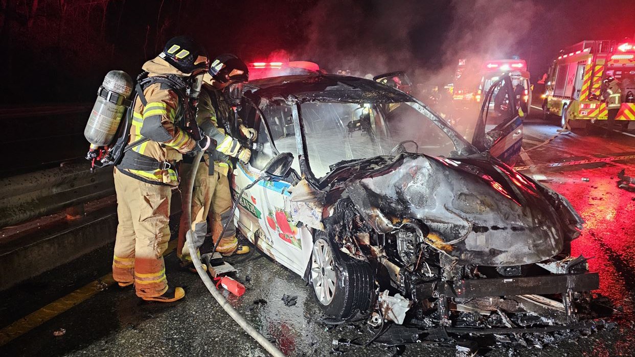 경북 예천서 택시가 25톤 크레인 들이받아 4명 다쳐···택시는 불에 타