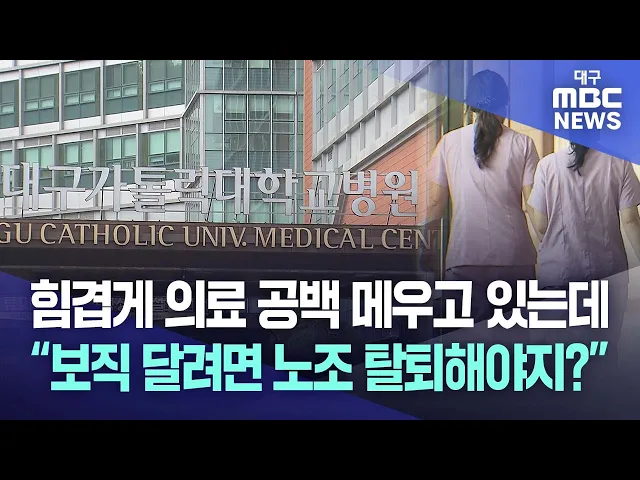 ◀앵커▶대구의 한 대학병원에서 간호사들에게 노조 탈퇴를 강요하고 있다는 폭로가 나왔습니다.전공의 사태 이후 의료 공백을 메우면서도 병원 경영난에 무급휴가까지 감내하고 있는데 병원 측이 노동조합을 무력화시키고 있다고 주장하고 있습니다.변예주 기자입니다.◀기자▶병원에서 간호사들이 피켓을 들었습니다.노조 와...