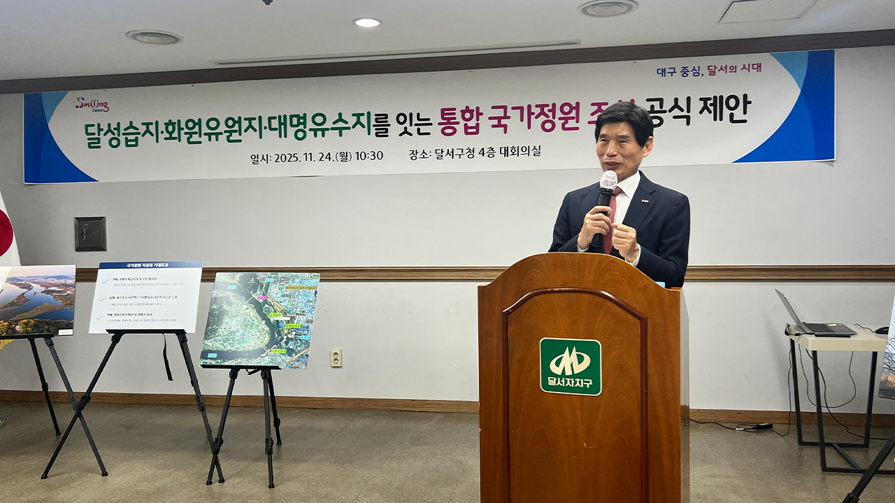 대구 달서구가 정부에 달성습지와 화원유원지, 대명유수지를 하나의 국가정원으로 지정하라고 촉구했습니다.이태훈 대구 달서구청장은 11월 24일 구청에서 기자 설명회를 열고 달성습지와 화원유원지, 대명유수지 248만여㎡를 통합 국가정원으로 조성해야 한다고 제안했습니다.이 구청장은 극심한 폭염을 겪고 있는 대구에...