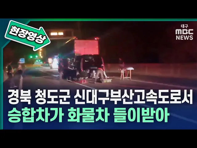 7월 9일 새벽 0시쯤 경북 청도군 신대구부산고속도로 대구 방향 청도 2터널 입구 인근에서 승합차가 12톤 화물차를 들이받았습니다.이 사고로 승합차 운전자인 50대 남성이 경상을 입어 병원으로 이송됐습니다.경찰은 고장으로 2차로에 서 있던 화물차를 승합차 운전자가 뒤늦게 발견해 사고가 난 것으로 보고 정확한 사고 ...