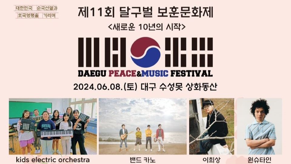 사진 제공 대구지방보훈청6월 호국보훈의 달을 맞아 제11회 달구벌 보훈 문화제가 6월 8일 수성못 상화동산에서 열립니다. 달구벌 보훈 문화제는 보훈의 가치를 시민들이 느낄 수 있도록 하는 참여형 보훈 문화행사입니다. 행사에서는 군, 경찰, 소방 등의 장비를 체험할 수 있는 전시와 수익금 중 일부를 국가유공자의 복...