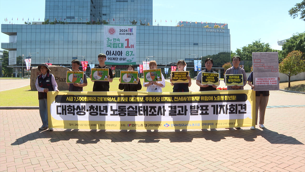 대구에서 일하는 청년들의 노동 여건이 열악하다는 설문조사 결과가 나왔습니다.민주노총 대구지역본부와 한국비정규교수노동조합 경북대분회, 경북대 동아리인 '오버더블랭크'는 6월 5일 오전 경북대에서 기자회견을 열고 청년들의 최저임금과 노동 인권을 보장하라고 촉구했습니다. 이들은 5월 13일부터 24일까지 근로 경...