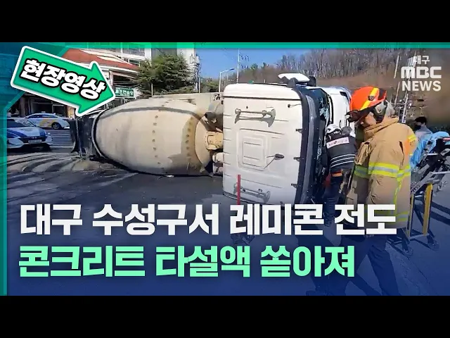 3월 21일 오후 2시 50분쯤 대구 수성구 만촌동 담티고가도로에서 두리봉 터널 방향 편도 4차로 중 2차로를 달리던 레미콘이 옆으로 넘어졌습니다.이 사고로 운전자인 60대 남성이 어깨 등을 다쳐 병원으로 옮겨졌고 도로에 콘크리트 타설액이 쏟아져 일부 차로가 통제됐습니다.경찰은 앞서가던 승용차가 황색 신호에 맞춰 ...