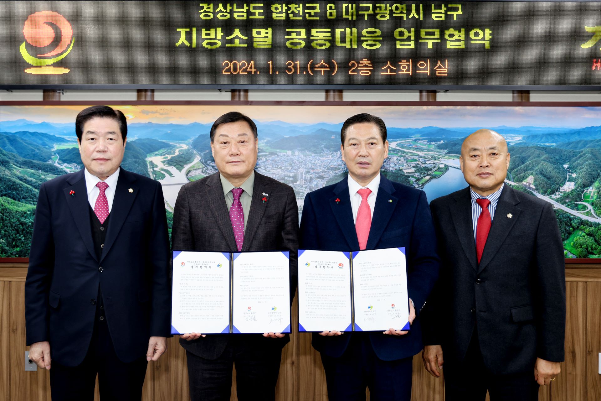 대구 남구와 경남 합천군은 1월 31일 오후 합천군청에서 지방 소멸 공동 대응을 위한 업무협약을 맺었습니다.두 자치단체는 지방 소멸을 막기 위해 행정과 교육, 문화 등 여러 분야에서 교류하고 협력 사업을 발굴해 추진할 예정입니다.