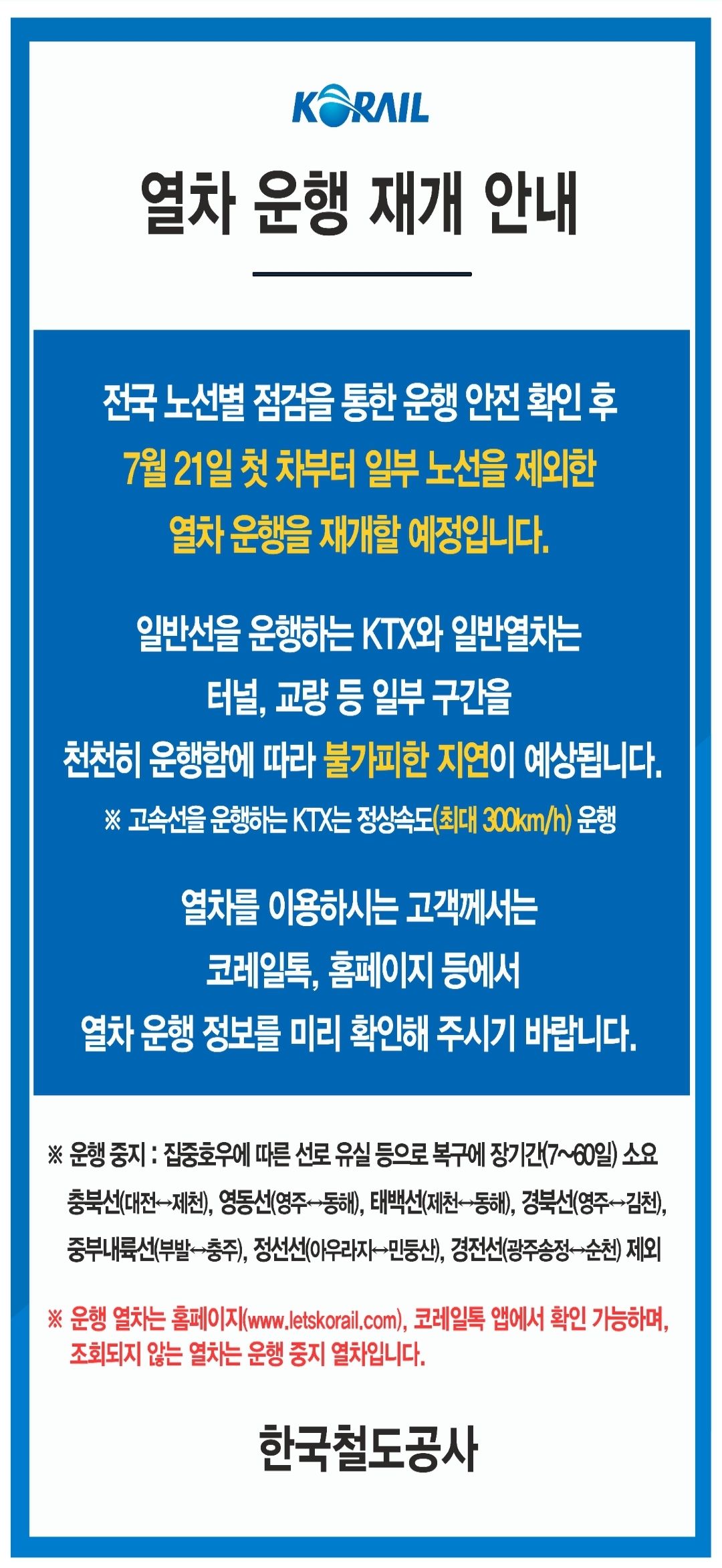 사진 출처 코레일코레일이 7월 21일 첫차부터 일반 열차의 운행을 대부분 다시 시작했습니다.다만 경북선 영주-김천 구간을 비롯해 충북선과 영동선 등 일부 구간은 집중호우로 선로가 유실돼 장기간 복구가 필요한 상태라 운행이 계속 중지됩니다.또 터널과 교량 등 취약 구간에서는 천천히 운행할 예정이라 지연될 수 있...