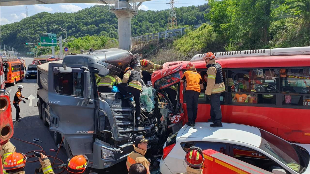 사진 제공 칠곡소방서5월 23일 오후 1시 40분쯤 경북 칠곡군 동명면 동명동호 나들목 인근 도로에서 화물차와 시내버스 등 차량 7대가 부딪히는 사고가 났습니다.이 사고로 버스 운전자 등 2명이 중상을 입어 병원으로 옮겨졌고, 승객 등 9명이 경상을 당했습니다.경찰은 화물차와 시내버스가 부딪치며 연쇄 사고가 났다는...