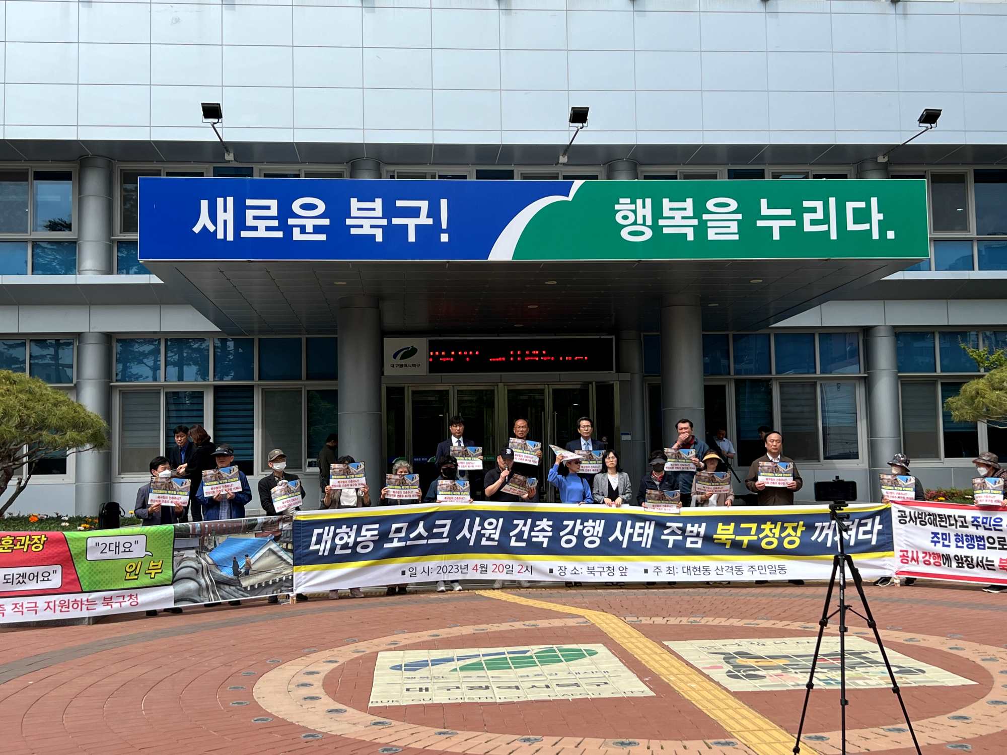 이슬람 사원 건축 반대 비상대책위원회는 4월 20일 오후 대구 북구청 앞에서 집회를 열고 구청에서 불법적인 이슬람 사원 건축을 용인하고 있다며 북구청장을 규탄했습니다.이들은 건축주가 도로 점용 허가 신청도 하지 않은 채 공사를 강행했지만 이를 용인하고, 지난 18일 공사 재개 때는 콘크리트 붓는 작업을 지휘했다...