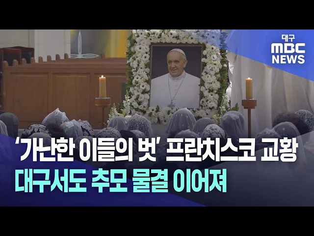 ◀앵커▶가난하고 소외된 사람들과 언제나 함께하면서 청빈한 삶을 통해 우리에게 많을 가르침을 주신 프란치스코 교황을 기리기 위한 마음이 대구에서도 하나둘 모이고 있습니다.대구와 경북에 마련된 분향소 5곳은 오는 토요일까지 운영됩니다.변예주 기자입니다.◀기자▶환한 미소를 띤 프란치스코 교황의 모습이 대성전에 ...