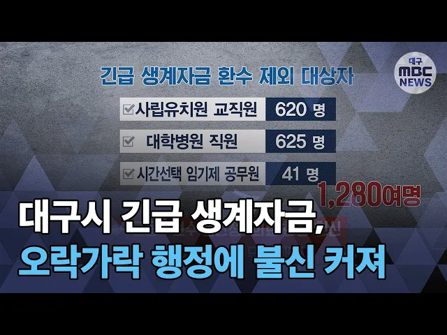 ◀ANC▶[남]대구시의 코로나19 긴급 생계자금을 둘러싼 혼선이 언제까지 계속될까요?부당 수령한 사람 가운데 고용과 보수가 불안정한 일부에 대해서환수하지 않기로 했었는데요.[여]대구시가 이번에는 같은 직종의 조건이 같은 모두에게 긴급 생계자금을 지급하기로 방침을 또 바꿨습니다. 더 많은 시민이 혜택을 보는 ...