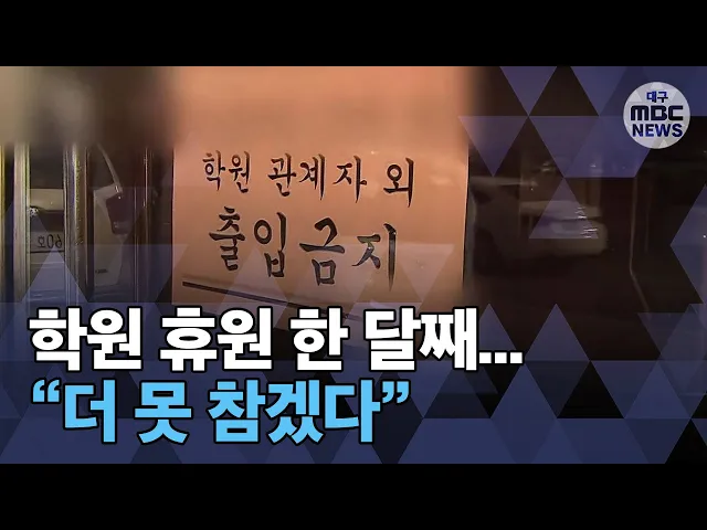 ◀ANC▶코로나19로 인한 피해가 사회 전 분야로 확산하고 있는 가운데 대구지역 학원가도 폐업 상태입니다.한 달째 문을 닫다 보니 극심한 경영난에 허덕이고 있는데,더는 못 참겠다는 목소리가 나오고 있습니다.윤태호 기자가 취재했습니다. ◀END▶ ◀VCR▶대구시내 한 입시학원.대구에서 코로나 첫 환자가 나온 직후...