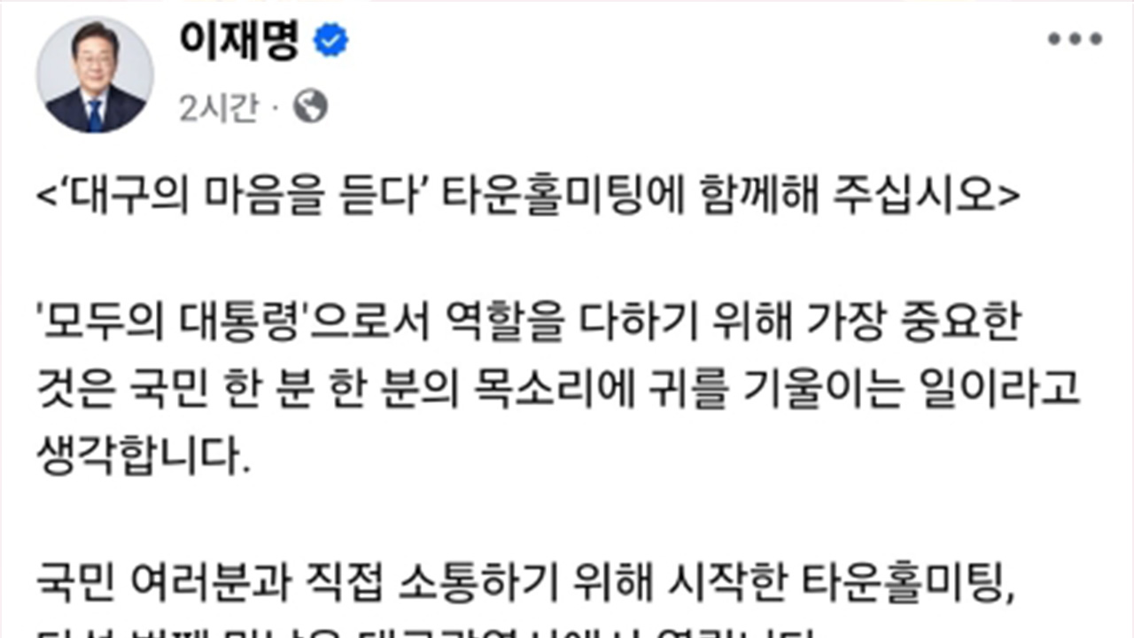 이재명 대통령이 오는 24일 대구에서 국민의 목소리를 직접 듣는 '타운홀미팅'을 엽니다.이 대통령은 페이스북에 참가자를 공개 모집하는 글을 올려 행사 계획을 알렸고, 구체적 시간과 장소는 경호상의 이유로 비공개했습니다.이 대통령은 "모두의 대통령으로서 역할을 다하기 위해 가장 중요한 것은 국민 한 분 한 분의 ...