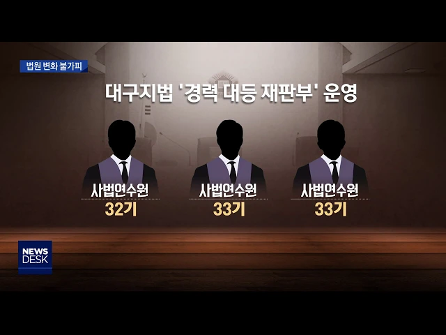◀ANC▶ 요즘 법원에는 경력 15년 이상의 부장급 고참 판사가 많아졌습니다. 검사나 변호사 가운데 판사를 뽑다 보니 생긴 현상인데, 이러면서 법원에도 적잖은 변화가 생기고 있습니다. 윤태호 기자가 취재했습니다. ◀END▶ ◀VCR▶ 대구지방법원은 '경력 대등 재판부'를 운영하고 있습니다. (C.G1)------------------...