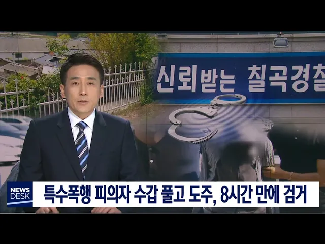 ◀ANC▶ 칠곡에서 특수폭행 혐의로 긴급체포된 30대 남성이 경찰서로 이송되던 중 수갑을 풀고 달아났다 8시간 만에 검거됐습니다 당시 경찰관이 3명이나 있었고, 경찰서 현관 앞까지 도착해 이런 일이 벌어졌습니다. 윤태호 기자가 취재했습니다. ◀END▶ ◀VCR▶ 오늘 새벽 칠곡군 석적읍 한 술집에서 34살 A 씨가 둔...