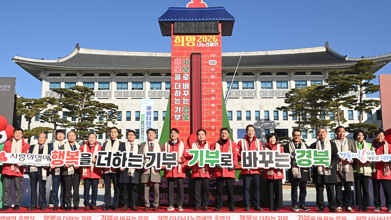 경상북도와 경북사회복지공동모금회는 '희망 2026 나눔 캠페인' 출범식과 사랑의 온도탑 제막식을 열고, 성금 모금 행사에 돌입합니다.'행복을 더하는 기부! 기부로 바꾸는 내일'이라는 슬로건으로 12월 1일부터 2026년 1월 31일까지 62일간, 모금액 176억 7천만 원을 목표로 모금 행사를 진행합니다.목표액의 1%에 해당하...