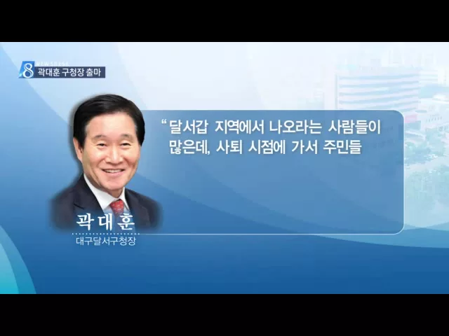 ◀ANC▶ 곽대훈 대구 달서구청장이 내년 총선에서 달서구에 출마하기로 했습니다. 바닥민심을 누구보다 잘 아는 3선 단체장의 등장으로 달서구 지역의 내년 선거판이 요동칠 전망입니다. 박재형 기자가 보도합니다. ◀END▶ ◀VCR▶ 곽대훈 대구 달서구청장이 내년 총선 출마 의사를 밝혔습니다. 곽 청장은 지역 사회 발...