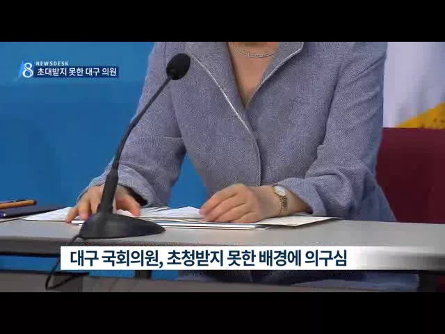 ◀ANC▶ 어제 박근혜 대통령이 우리 지역을 방문했는데, 어찌된 영문인지 지역 국회의원들은 한명도 초청을 받지 못했습니다. 대통령 방문에 여당 국회의원들이 배석하는 관례가 깨진 겁니다. 여] 정책을 논의하는 자리여서 굳이 초청할 이유가 없었다는게 대구시의 해명이지만, 유승민 의원 사태와 맞물려 여러 해석들이 ...