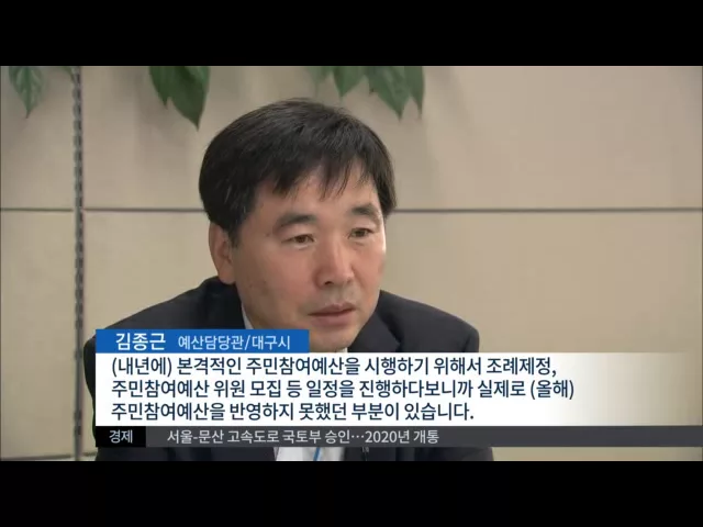 인구 100만명 이상 전국 10개 도시 가운데 올해 주민참여예산을 한푼도 배정하지 않은 유일한 곳이 대구시라고 하는데요, 자! 이를 두고 주민참여예산제 운영에 의지가 없는 것 아니냐는 비판이 나오고 있다지 뭡니까요. 대구시 김종근 예산담당관 "내년에 본격적으로 시행하려고 조례도 만들고 주민참여예산 위원도 모집하...