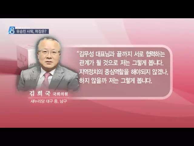 ◀ANC▶ 오늘은 정가 소식으로 뉴스 시작합니다. 많은 지역민들이 오늘 새누리당 유승민 원내대표의 모습을 언론을 통해 지켜보셨을텐데요. 유 의원이 결국 원내대표직에서 물러났습니다. 여] 국회법 개정안 파문의 책임을 져야한다는 의원총회의 사퇴권고를 받아들인건데, 유 의원 본인 뿐만아니라 지역 정치권에도 파장...