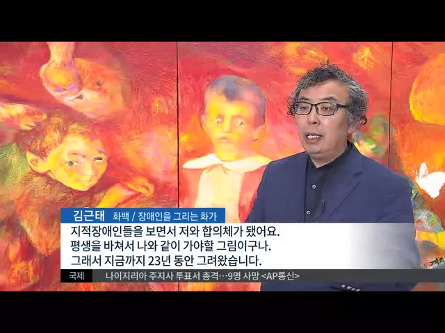 ◀ANC▶ 20년 넘게 지체장애인들만 그려온 서양화가 김근태 화백이 물포럼 기간에 맞춰 대구에서 전시회를 열고 있습니다. 물을 소재로 한 설치작품도 전시되고 있습니다. 윤태호 기자가 취재했습니다. ◀END▶ ◀VCR▶ 100호 짜리 그림 77개를 붙인 102미터 길이의 이 작품은 김근태 화백이 3년에 걸쳐 완성한 대작입니...