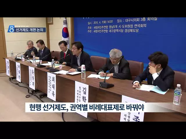 ◀ANC▶ 권역별 비례대표제를 골자로 한 중앙선관위의 선거제도 개편안을 두고 새정치민주연합 영남권 시·도당이 활발한 논의를 이어가고 있습니다. 여] 내년 총선이 지역 일당독점을 깰 수 있는 절호의 기회라고 보고, 여론을 결집하는 동시에 당론으로 확정하는데 총력을 기울이고 있습니다. 이상원 기자가 보도합니다. ...