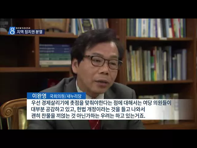 ◀ANC▶ 지방분권을 위한 개헌 운동은 사실 우리 지역에서 시작됐다고 해도 과언이 아닙니다. 전국적으로 여론을 확산시키는 나름의 성과를 거두고 있지만, 정작 지역 정치권은 분열돼 있어 아쉬움을 남기고 있습니다. 윤태호 기자가 취재했습니다. ◀END▶ ◀VCR▶ 개헌보다는 경제살리기가 더 절실하다는 박근혜 대통...
