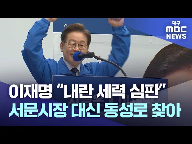 ◀앵커▶더불어민주당 이재명 대선 후보가 후보 선출 이후 처음으로 대구를 방문했습니다.내란 세력 심판과 국민이 국가의 주인임을 보여주는 대선이라고 강조하면서, 자기도 TK 출신이라는 것을 부각하며 대구와 경북 유권자들의 지지를 호소했습니다.윤태호 기자가 보도합니다.◀기자▶더불어민주당 이재명 후보가 유세지로 ...