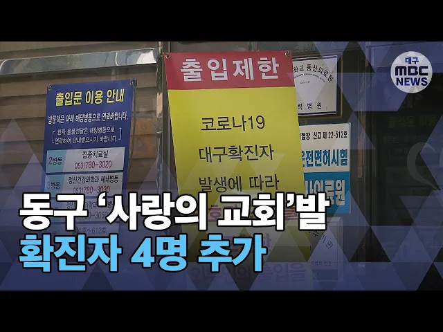 ◀ANC▶어제까지 34명의 코로나 19 확진자가 나온 대구 동구 사랑의 교회에서 오늘도신도 2명과 접촉자 2명까지 모두 4명이확진 판정을 받았습니다. 신도가 아닌 접촉자가 양성 판정을 받은 건 이번이 처음입니다.확진자들이 다중 이용 시설을 다녀간 것으로 드러나 방역 당국이 바짝 긴장하고 있습니다.윤태호 기자가 취...