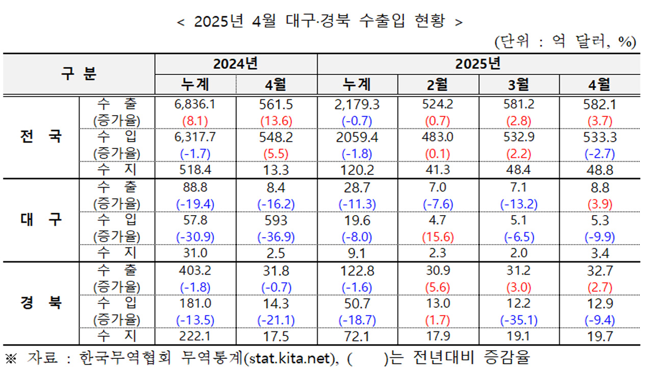 대구 지역 수출이 1년 10개월 만에 증가세로 전환했습니다. 한국무역협회 대구경북지역본부가 발표한 '2025년 4월 대구·경북 수출입 동향 보고서'를 보면 4월 대구의 수출은 전년 동기 대비 3.9% 증가한 8억 8천만 달러로 집계됐습니다. 대구 수출은 2023년 7월부터 2025년 3월까지 21개월 연속 마이너스 성장을 기록하다 2...