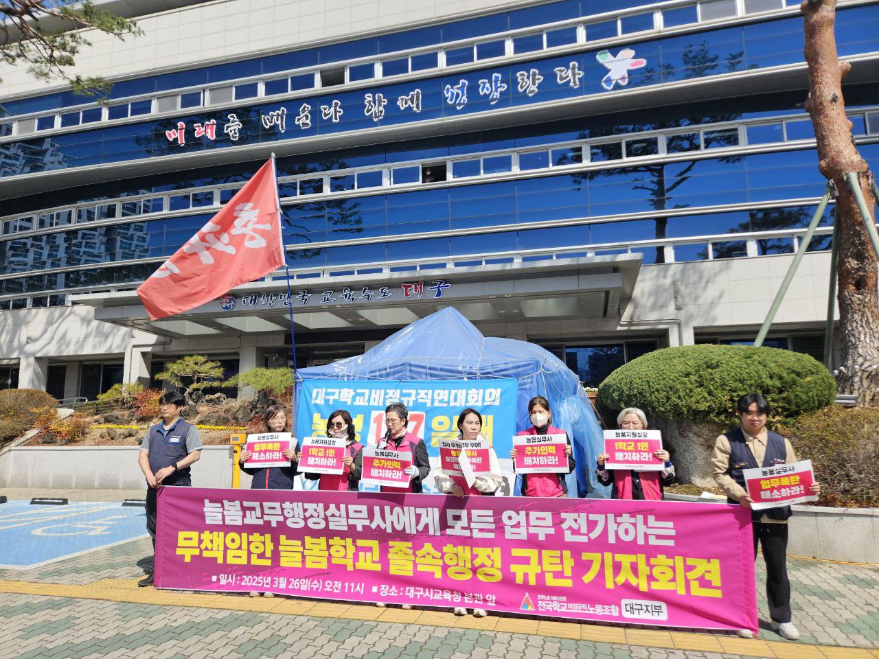 "대구 늘봄학교, 실무진 업무 과중···한 사람이 4명의 업무 수행"대구 늘봄학교 운영을 두고 실무진 업무가 과중하다는 주장이 제기되면서 논란입니다.전국학교비정규직노조 대구지부는 3월 26일 오전 대구시교육청 앞에서 기자 회견을 열고 "대구시교육청이 올해부터 본격적으로 시행한 늘봄학교 운영과 관련해 실무자들에...