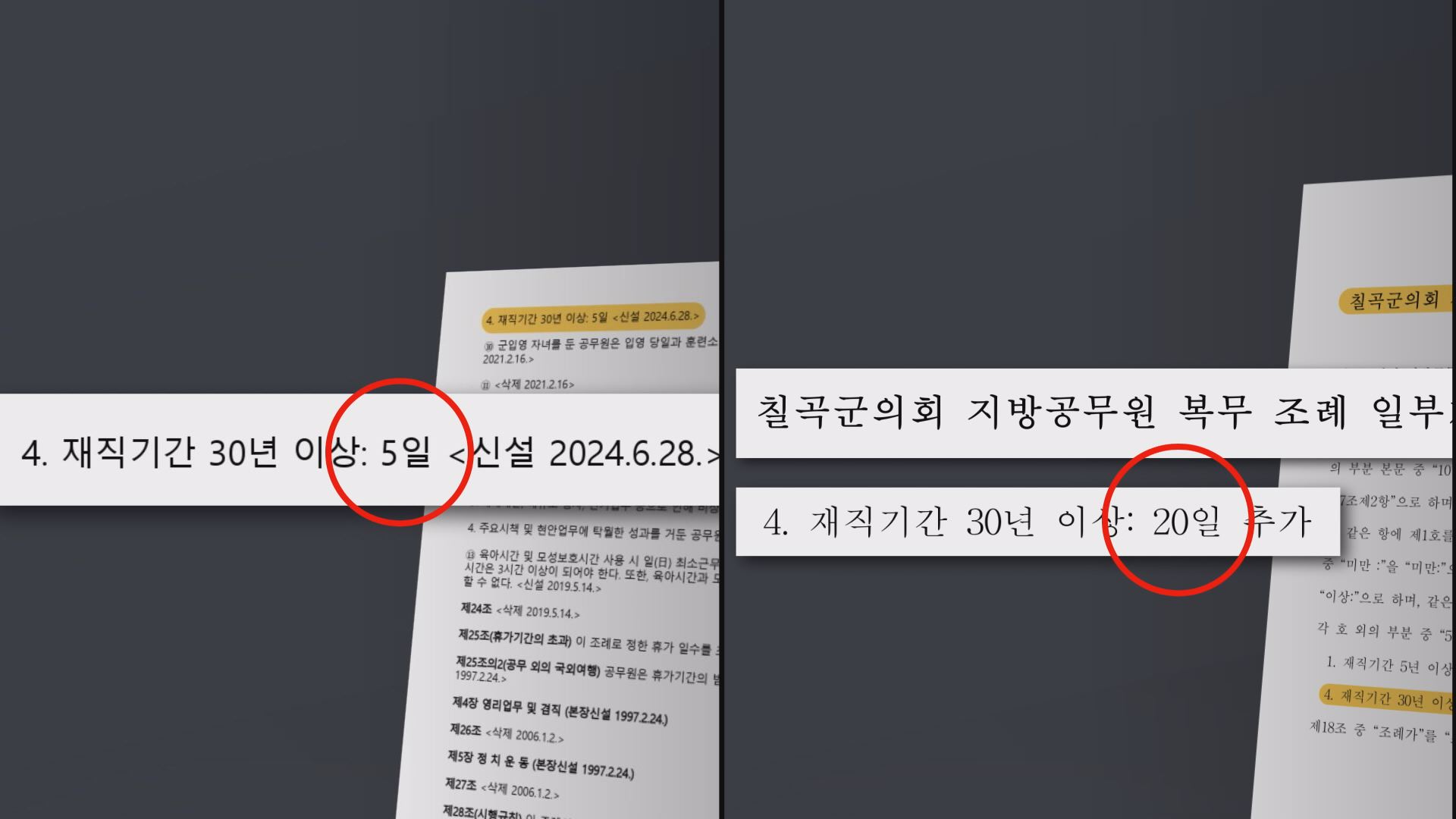 "한 울타리 안에서 근무하는 같은 지방공무원인데 휴가가 15일이나 차이가 난다고?"한 울타리 안에서 근무하는데 군청 직원은 30년 이상 근무하면 휴가를 5일 주는데 군의회 직원은 20일.무려 15일이나 차이가 난다고? 같은 지방공무원 아냐? 예전에는 군청에서 근무하다가도 인사이동이 있으면 의회에 근무하는 게 다반사...