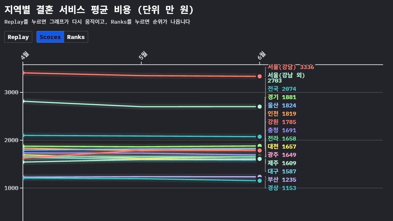 A Flourish chart결혼 서비스 전체 비용이 지역 간 최대 3배가량 차이가 나는 것으로 나타났습니다.한국소비자원이 전국 14개 지역 소재 결혼 서비스 업체 515개사를 대상으로 결혼식장과 스튜디오, 드레스, 메이크업 등 이른바 '스드메' 패키지 비용을 합산한 6월 결혼 서비스 비용을 조사한 결과 평균 2,074만 원으로 지...
