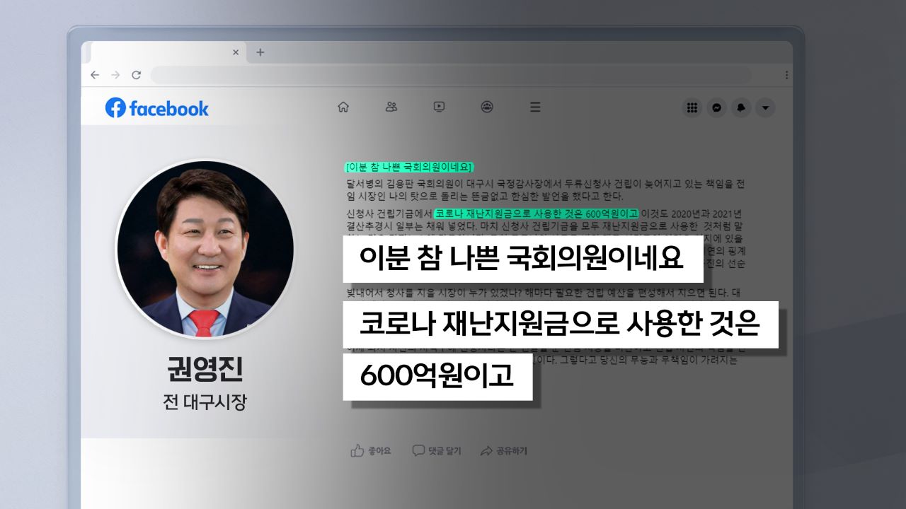 국정감사에서 '대구시 신청사 건립 문제' 지적10월 23일 대구시청에서는 대구시를 상대로 한 국회 국정감사가 열렸습니다. 이 자리에 참석한 대구시 달서구 병 지역구 국민의힘 김용판 국회의원은 '신청사 건립 지연 문제'에 관한 질의를 했는데요.김 의원은 빚내서 청사를 짓는 것은 자신도 동의하지 않는다며 운을 뗐습니...