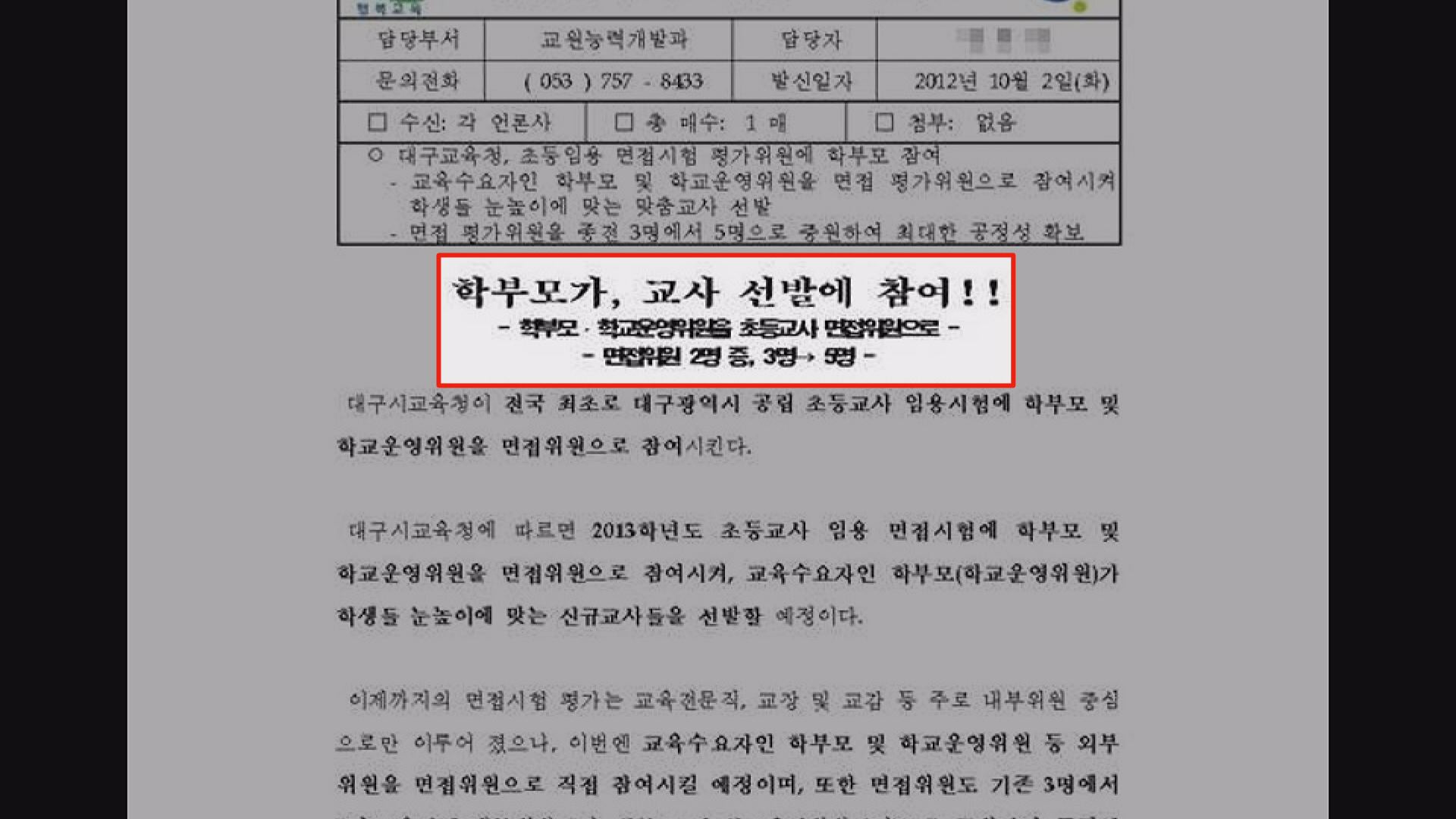 대구 교육청이 공립 초등학교 교사 임용 시험에 최근 10년 동안 학부모를 면접시험 평가위원으로 참여시켜 온 사실이 알려지면서 일선 교사들이 크게 반발하고 있습니다.교사들은 학부모 위원을 교사 임용 과정에서 즉각 배제하고 교사들에게 사과할 것을 요구하고 있습니다. 학부모 면접시험 평가위원 참여, 언제부터?대구...