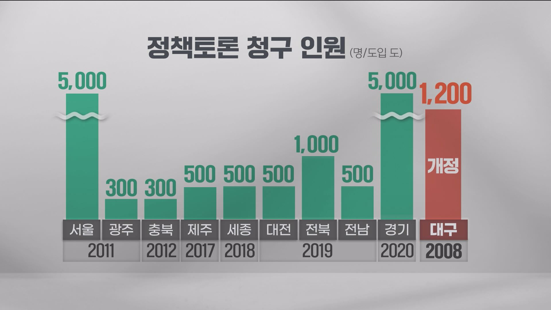 ◀앵커▶대구시민들이 대구시 정책에 참여하기 위한 방법으로 정책토론 청구 제도가 있습니다.대구에서 가장 먼저 조례로 제정해 도입한 뒤 전국으로 확대된 겁니다. 최근 정책토론을 열기 위한 청구 인원을 대폭 늘리는 등 제도를 개정했는데, 다른 지역 기준과 맞추기 위한 것이라고 설명했습니다.그래서 전국의 시행 현황...