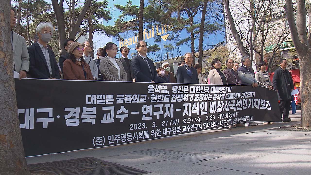 ◀앵커▶한일 정상회담이 끝난 후폭풍이 잦아들기는커녕 점점 커지고 있습니다.윤석열 대통령은 3월 21일 국무회의에서 대일 외교 관련 자신의 생각을 밝혔는데, 기존 정부 주장의 반복이었습니다.이런 가운데 21일 대구에서는 교수·연구자 단체에서 비상 시국선언을 하는 등 반발이 커지고 있습니다.일제 강제노역 피해자 제...
