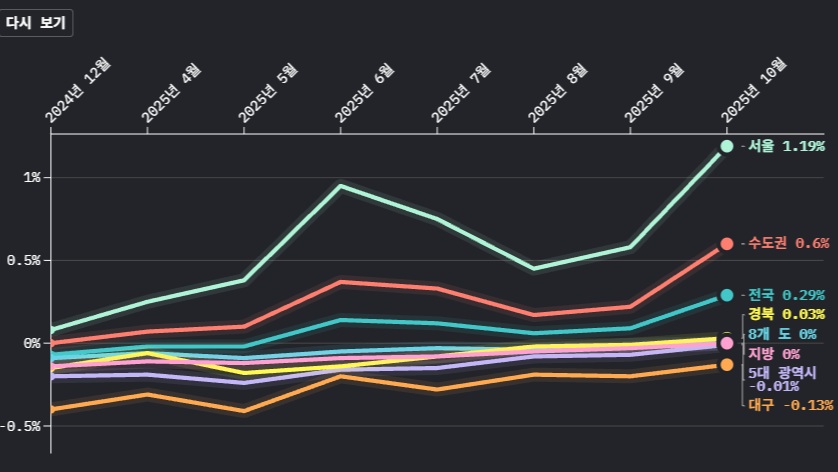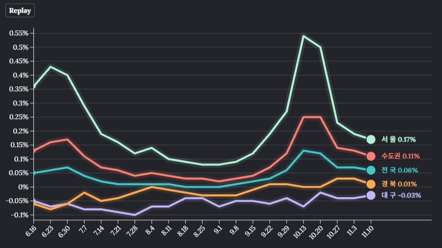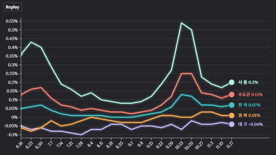 Made with Flourish • Create a chart 대구의 아파트 매매가격이 103주째 하락했습니다.한국부동산원의 2025년 11월 셋째 주(11월 17일 기준) 주간 아파트 가격 동향을 보면 대구의 아파트 매매가격은 한 주 전보다 0.04% 떨어졌습니다.전셋값은 0.03% 오르며 8주 연속 상승세를 이어갔습니다. 전국 아파트 매매가격은 0...