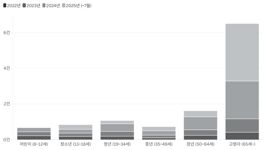 Made with Flourish • Create a chart65살 이상 고령자의 버스·지하철 안전사고 발생 빈도가 청년층의 5배에 이르는 것으로 나타났습니다. 2022년부터 2025년 7월까지 한국소비자원 소비자위해감시시스템(CISS)에 접수된 버스·지하철 관련 안전사고는 1,034건으로 2022년 125건에서 2024년 460건으로 해마다 크게 증가하고 ...