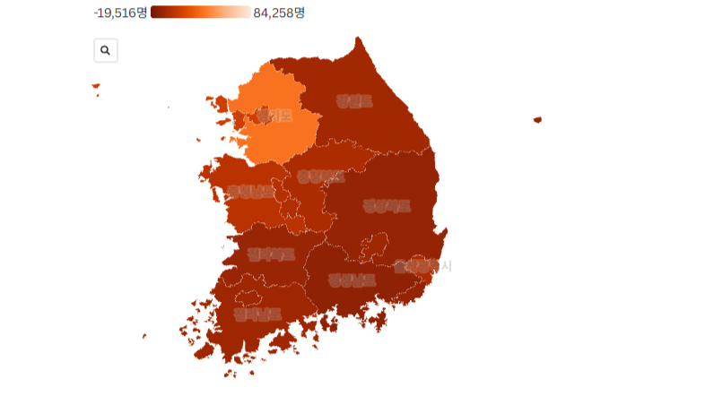Made with Flourish • Create a map2024년 청년 인구 순유출이 가장 많았던 지역은 경남과 경북, 부산으로 나타났습니다.더불어민주당 허성무 의원(경남 창원 성산구, 예산결산특별위원회)이 국가데이터처 자료를 분석한 결과 2024년 수도권과 세종, 대전을 제외한 12개 광역자치단체에서 만 20살에서 39살 사이 청년 6만 2...