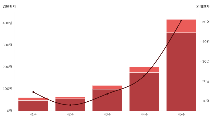 Made with Flourish • Create a chart독감이 어린이와 청소년을 중심으로 빠르게 확산하고 있습니다.질병관리청에 따르면 지난 11월 2일부터 8일까지 독감 의심 환자는 외래환자 천 명당 50.7명으로, 전주보다 122.4% 급증했습니다.특히 7살에서 12살 사이 어린이 환자는 천 명당 138명으로 두 배 넘게 뛰었고, 영유아와 청...