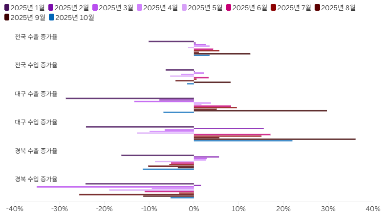 2025년 10월 대구와 경북의 수출이 동반 하락했습니다.한국무역협회 대구경북지역본부가 발표한 '2025년 10월 대구․경북 수출입 동향 보고서'를 보면 10월 대구의 수출은 전년 동기 대비 6.8% 감소한 6억 8천만 달러로 집계됐습니다.경북은 11.4% 감소한 34억 8천만 달러였습니다.대구는 이차전지소재 수출이 큰 폭으로 ...