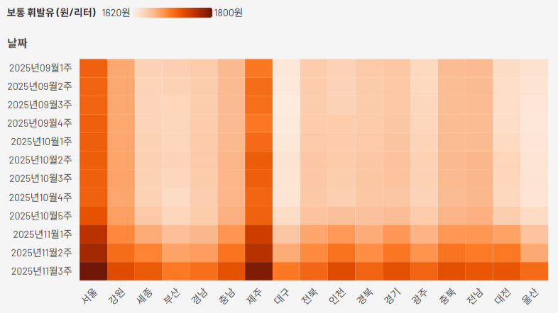 대구 주유소 기름값이 4주 연속 동반 상승했습니다.한국석유공사 유가 정보 서비스 오피넷에 따르면 2025년 11월 셋째 주 대구의 주유소 휘발유(보통 휘발유) 평균 판매가격은 한 주 전보다 리터당 30.8원 오른 1,706.5원으로 집계됐습니다.10월 다섯째 주부터 4주 연속 오르면서 지난 2월 둘째 주 이후 40주 만에 1,700원...