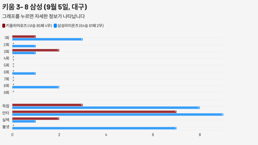 A Flourish chart9월 들어 연패가 없는 삼성라이온즈가 시즌 마지막 광주 원정에서 연승에 도전합니다.9월 9일 저녁 광주KIA챔피언스필드에서 펼쳐지는 2025 신한 SOL 뱅크 KBO리그 KIA타이거즈와의 2연전 첫 경기에서 삼성은 일요일 한화이글스를 상대로 거둔 승리의 기운을 이어, 연승으로 가을야구에 한 발 더 다가서겠...