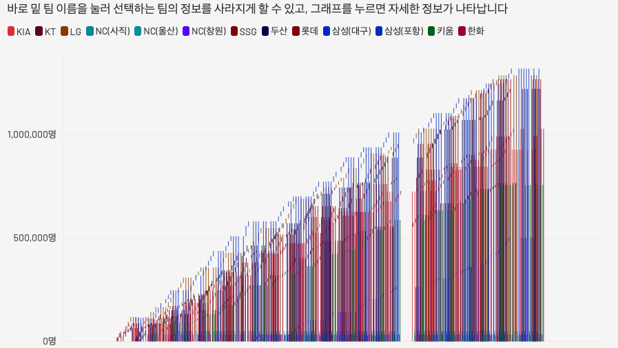 A Flourish chart시즌 47번의 매진으로 KBO리그 최초 시즌 140만 관중을 돌파한 삼성라이온즈가 상대적으로 높은 홈 승률의 흐름을 이어 가을야구에 한 발 더 다가섭니다.9월 5일 대구삼성라이온즈파크에서 펼쳐진 2025 신한 SOL 뱅크 KBO리그 키움히어로즈와의 맞대결에서 삼성은 9월 첫 매진을 기록하며 시즌 관중 140만 ...