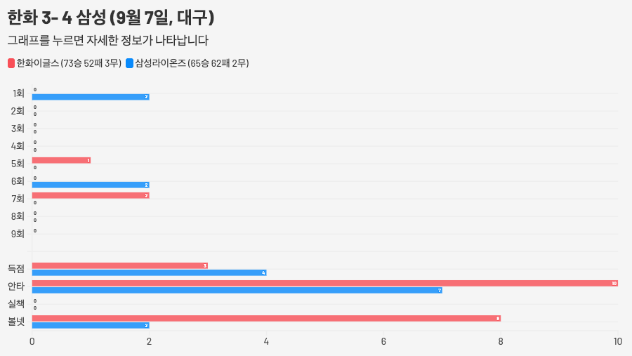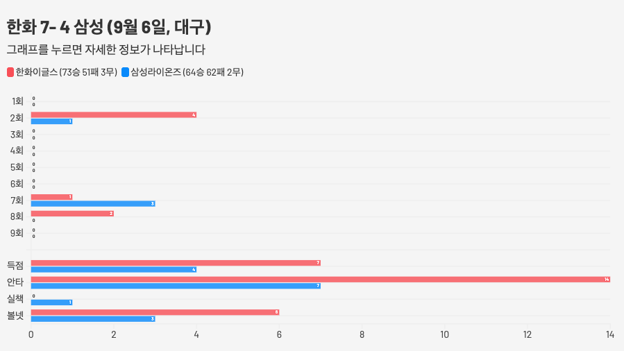 A Flourish chart병살타를 4개나 만든 수비가 있었지만, 스스로도 병살타 2개와 아쉬운 결정적 실책을 기록한 삼성라이온즈가 '연승' 달성에 실패합니다.9월 6일 대구삼성라이온즈파크에서 펼쳐진 2025 신한 SOL 뱅크 KBO리그 한화이글스와의 주말 2연전 첫 경기에서 삼성은 선발 좌완 이승현이 실책 하나로 조기에 무너지...