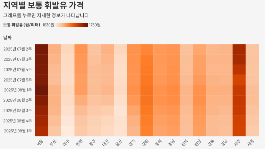 A Flourish heatmap대구 주유소 기름값이 4주 연속 하락했습니다.한국석유공사 유가 정보 서비스 오피넷에 따르면 2025년 9월 첫째 주 대구의 주유소 휘발유(보통 휘발유) 평균 판매 가격은 한 주 전보다 2.2원 내린 리터당 1,630.6원으로 8월 둘째 주부터 4주째 하락했습니다. A Flourish heatmap자동차용 경윳값도 한 주 ...