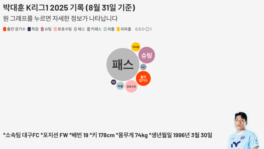 A Flourish bubble chart119일, 16경기 동안 승리가 없었던 대구FC가 멀티 골로 K리그1 데뷔 득점을 기록한 박대훈의 활약에 힘입어 간절했던 승리를 맛봅니다.8월 30일 저녁 대구iM뱅크파크에서 펼쳐진 하나은행 K리그1 2025 수원FC와의 28라운드에서 대구는 전반 페널티킥 실점으로 끌려갔지만, 후반 집중력을 바탕으로 3...
