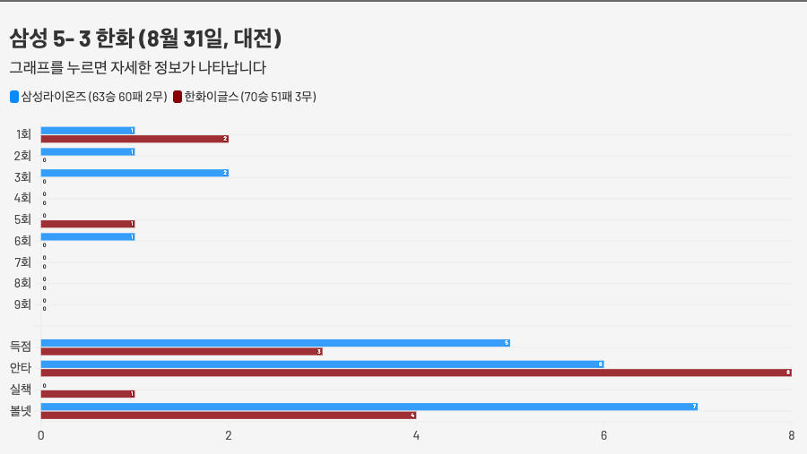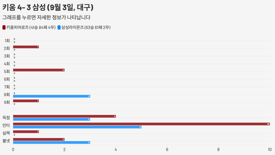 Interactive content by Flourish8월을 연승으로 마무리했던 삼성라이온즈가 9월을 패배로 시작한 가운데 연패 없이 다시 승리로 분위기를 가져올지 관심이 쏠립니다.9월 3일 저녁 대구삼성라이온즈파크에서 펼쳐진 키움히어로즈와의 3연전 첫 경기에서 삼성은 상대 선발 하영민 공략에 어려움을 보이며 끌려가는 경기를 펼...