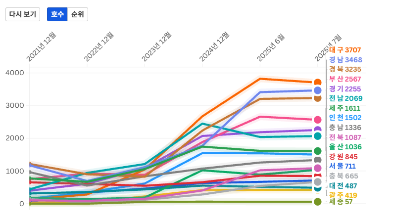 A Flourish chart2025년 8월 대구와 경북의 소비자 물가 상승률이 1%대로 떨어지며 2025년 들어 최저 수준을 기록했습니다.동북지방통계청이 발표한 '2025년 8월 대구·경북 소비자물가 동향'에 따르면 8월 대구의 소비자물가 지수는 116.32(2020년=100)으로 1년 전 같은 달보다 1.6% 상승했습니다.2024년 10월 1.2%를 기록...