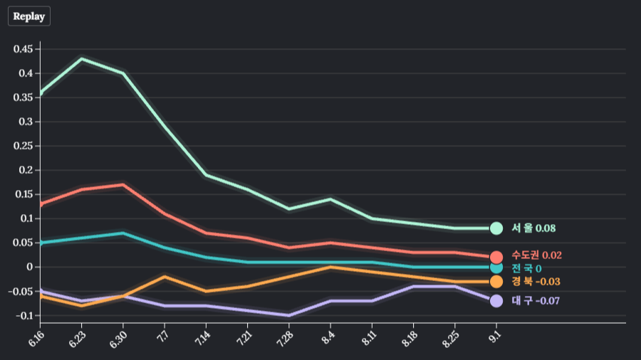 A Flourish chart대구 아파트 매매가격이 93주째 하락했습니다. 한국부동산원의 2025년 9월 첫째 주(9월 1일 기준) 주간 아파트 가격 동향에 따르면 대구의 아파트 매매가격은 한 주 전보다 0.07% 떨어졌습니다. 달서구(-0.11%)는 상인·용산동 구축 위주로, 서구(-0.10%)는 중리·내당동 중소형 규모 위주로, 북구(-0.08%)는...