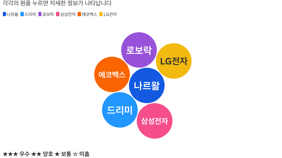 A Flourish bubble chart로봇청소기 일부 제품에서 사생활 노출과 개인정보 유출 위험이 발견됐습니다.한국소비자원은 한국인터넷진흥원과 시중에 유통 중인 로봇청소기 6개 제품의 보안 실태를 조사한 결과, 일부 제품에 사생활 침해와 개인정보 유출 가능성이 있어 즉시 조치했다고 밝혔습니다. 나르왈, 드리미, 에코백스...